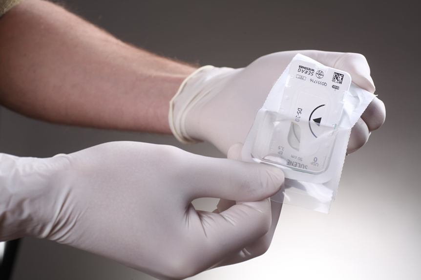 - Sarung tangan steril mempunyai sampul luar yang melidungi kelonsong dalam yang steril. Jika melakukan tugas bersendirian, buka sepenuhnya sampul ini dahulu diatas permukaan yang rata dan mencukupi besarnya sebelum mencuci tangan. Jika ada pembantu, ia perlu memasukkan kelonsong dalaman tersebut kedalam medan steril.