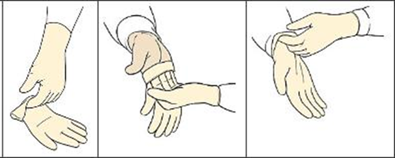 - Masukkan jari dan tapak tangan yang hendak dipakaikan sarung (biasanya kiri) sambil menarik kuat pergelangan sarung dengan jari telujuk dan ibu jari yang bertentangan (kanan) tadi. Biarkan pergelangan itu dalam keadaan berlipat. Bahagian yang disentuh dengan jari tadi dianggap tidak lagi steril tetapi bahagian hujung yang tidak disentuh masih steril.